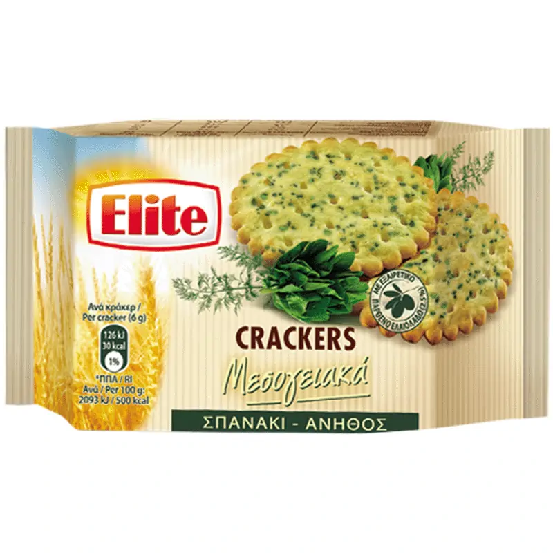Съставки: пшеничено брашно, растителни мазнини (палмово масло, фракционирано палмово масло, масло от палмови ядки), захар, най-висока категория маслиново масло получено директно от маслини само с механични средства(2,5%), изсушен спанак (2%), изсушен лук, изсушен праз лук.